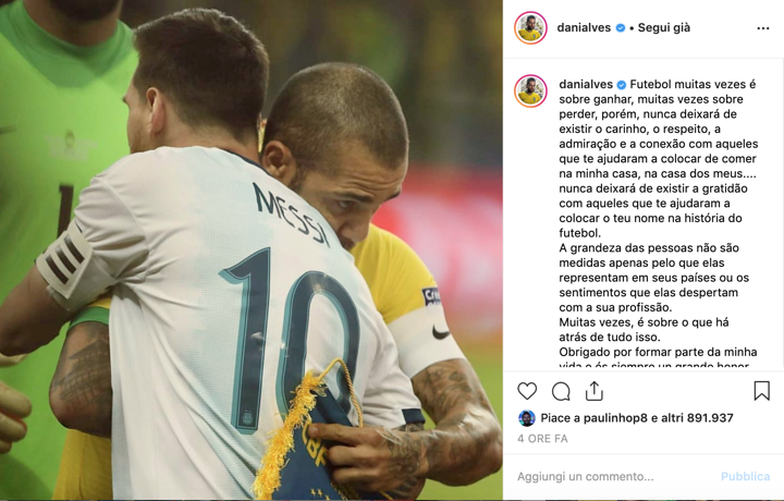 After beating Argentina, Dani Alves has published a latter in his Instagram to send an emotional message to Messi.